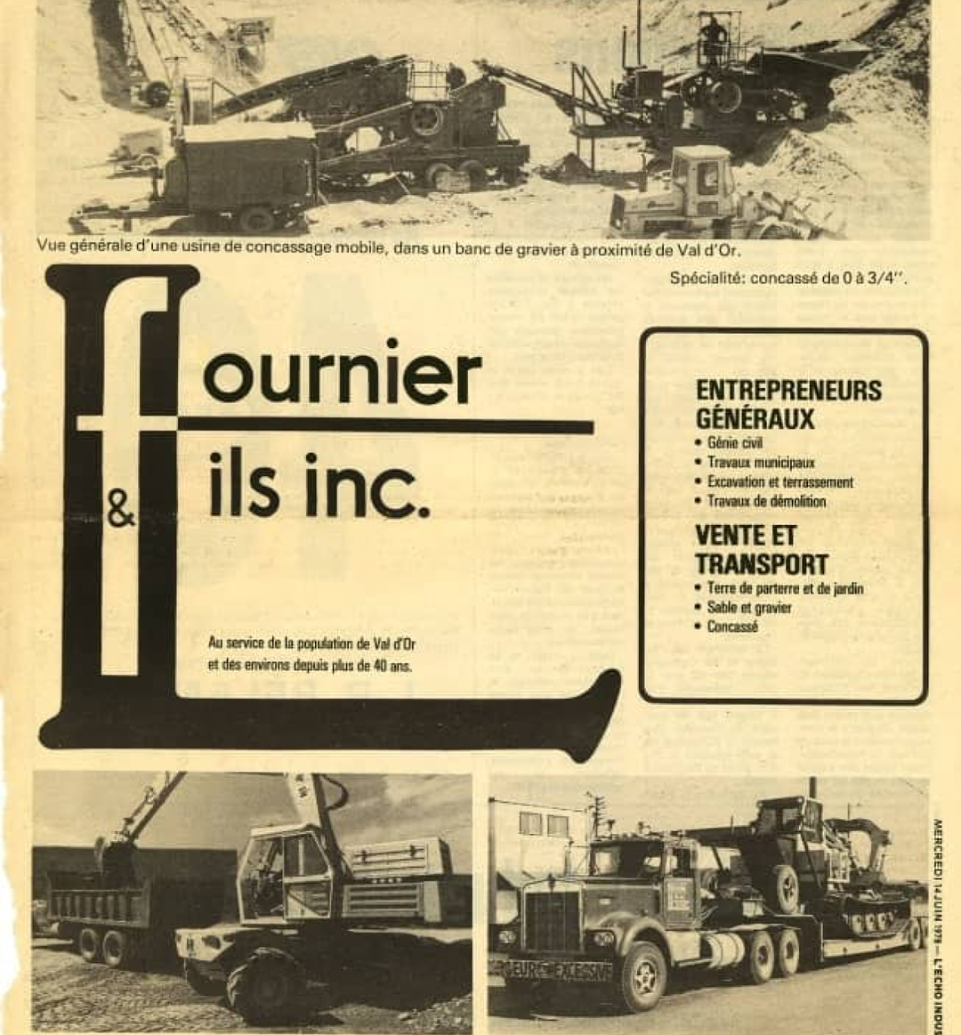 Fournier et Frères devient L. Fournier & Fils. Ce changement officialise l’union de deux générations travaillant conjointement dans les secteurs de l’excavation, de la construction de routes, du concassage, du génie civil et autres domaines connexes